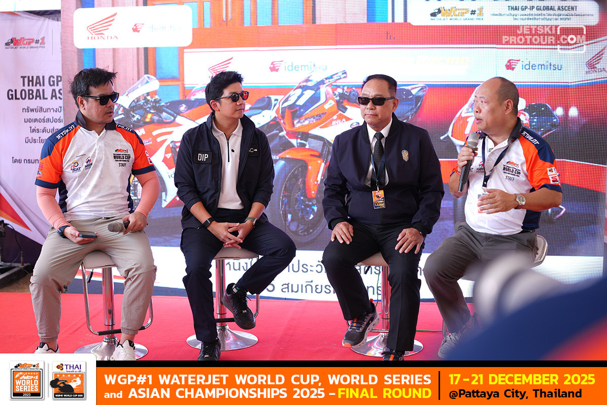 ระหว่างการแข่งขันมีช่วงเสวนากันของ พล.ต.อ.เดชณรงค์ สุทธิชาญบัญชา นายกสมาคมกีฬาเจ็ตสกีแห่งประเทศไทย, นายภเชศ จารุมนต์ ผอ. ศูนย์ให้คำปรึกษาด้านทรัพย์สินทางปัญญากรมทรัพย์สินทางปัญญา กระทรวงพาณิชย์ และนายปริเขต สืบสหการ ผู้อำนวยการทัวร์นาเม้นท์ WGP#1 ถึงความสำเร็จของวงการเจ็ตสกีไทย ภายใต้โครงการ THAI GP-IP GLOBAL ASCENT “ทรัพย์สินทางปัญญามอเตอร์สปอร์ตไทย ไต่สู่ระดับสู่สากล มีประโยชน์มหาศาล”