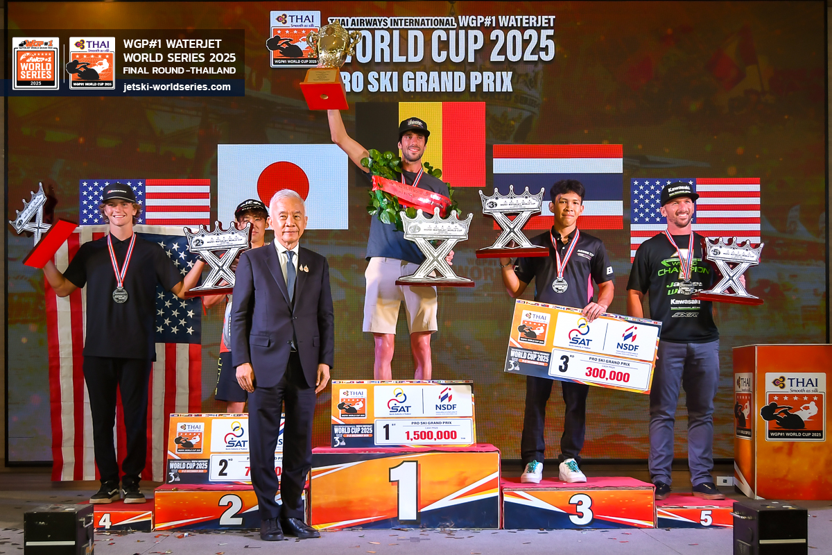 โดยในส่วนของศึกเวิลด์คัพ นักเจ็ตสกีไทย ประกาศักดากวาดแชมป์โลกไปครองถึง 13 รุ่น ขณะเดียวกันสุดยอดนักแข่งเรือยืนทีมชาติไทยเจ้าของเหรีญเงินเจ็ตสกีซีเกมส์ 2025 ซึ่งมีดีกรีเป็นแชมป์ประเทศไทยเรือยืนที่แรงและเร็วที่สุด รุ่น PRO-AM SKI GRAND PRIX ถึง 3 สมัย อย่าง อานนท์ หงษ์กลาง เจ้าของเบอร์ #T19 จากทีม BANGKOK JET CLUB BY FAST POWERSPORTS THAILAND ก็สร้างประวัติศาสตร์ เป็นนักแข่งไทยคนแรก ที่ผงาดติดท็อปทรี ของรุ่นเรือยืนรุ่นใหญ่ ระดับมืออาชีพ PRO SKI GRAND PRIX โดนแชมป์โลกในรุ่นนี้ ตกเป็นของ กินเตน บอสช์ ราชาเรือยืนจากเบลเยี่ยม ส่วนอันดับ 2 คือ นักแข่งญี่ปุ่น โตชิ “ซามูไร” โอฮาระ แชมป์เอเชียคนล่าสุด