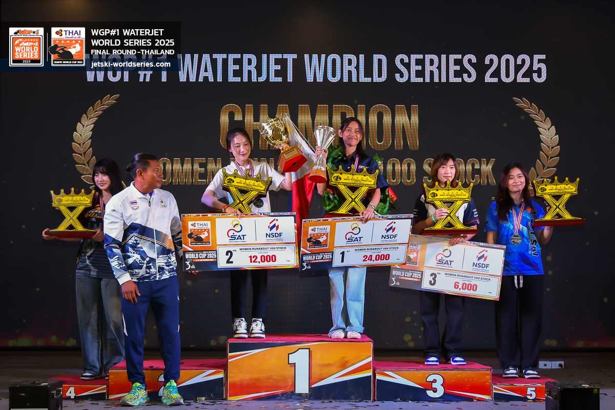 โดยในส่วนของรุ่นเรือนั่งหญิง 1,100 ซีซีห้ามแต่งเครื่องยนต์ (WOMEN RUNABOUT 1100 STOCK) ตำแหน่งแชมป์เวิลด์คัพ ตกเป็นของ คริสทีน เคท แมร์ชาโด้ ยอดนักเจ็ตสกีของฟิลิปปินส์ เจ้าของเรือแข่งเบอร์ PH28 ที่ทำแต้มรวมใน 3 โมโต ได้ทั้งหมด 163 คะแนน คว้าแชมป์โลกปีนี้ไปครอง พร้อมทั้งซิวแชมป์เอเชียไปได้อีกตำแหน่งด้วย ส่วนรองแชมป์เวิลด์คัพเป็นของนักซิ่งบนผิวน้ำสาวไทย “น้องมีโอ” ศศินา ผิวงาม เบอร์เรือ T26 จากทีม YAMAHA WAVE RUNNER THAILAND X MRC POS PZ SHOP SAMUT SAKHON ที่ทำคะแนนได้ 146 แต้ม พลาดแชมป์โลกอย่างน่าเสียดาย ทำให้อันดับไม่ดี ขณะที่อันดับ 3 เป็นของ ชนาภา ผลไม้ นักแข่งไทยอดีตแชมป์คิงส์คัพ ปี 2024 ที่ทำได้ 118 คะแนน