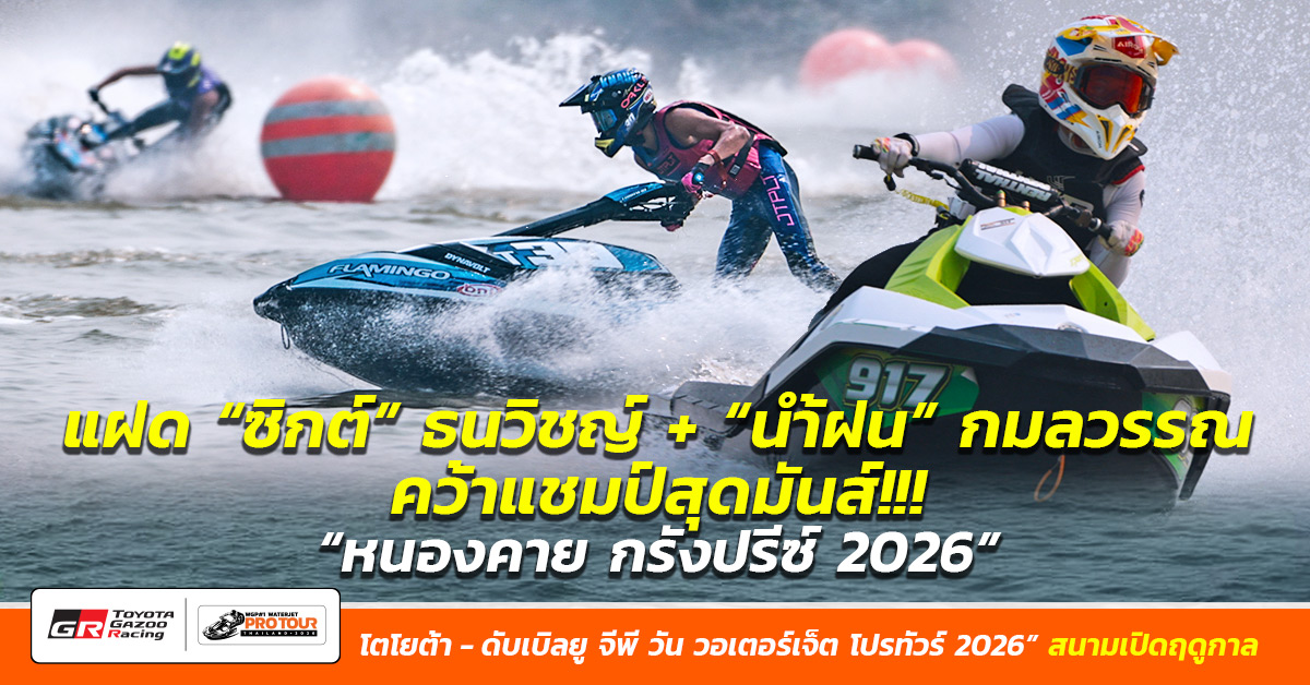 แฝดสายฟ้า “ซิกต์” ธนวิชญ์ โมลี และ“น้ำฝน” กมลวรรณ เนินหงษ์ คว้าแชมป์ในรอบชิงชนะเลิศอย่างสุดมันส์ “หนองคาย กรังปรีซ์ 2026” หรือ ศึกเจ็ตสกีชิงแชมป์ประเทศไทย “โตโยต้า - ดับเบิลยู จีพี วัน วอเตอร์เจ็ต โปรทัวร์ ไทยแลนด์ 2026” สนามเปิดฤดูกาล ที่ระเบิดความมันส์ในวันที่ 2-5 เมษายน 2569 นี้ ณ บึงหนองคาย เทศบาลตำบลวัดธาตุ จ.หนองคาย