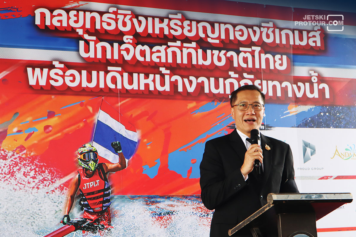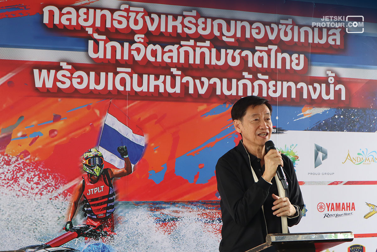 โดย “บิ๊กเปี๊ยก” พล.ต.อ.เดชณรงค์ สุทธิชาญบัญชา นายกสมาคมกีฬาเจ็ตสกีแห่งประเทศไทย กล่าวเปิดเผยถึงความพร้อมของทัพเจ็ตสกีทีมชาติไทยในการล่าเหรียญทองกีฬาซีเกมส์ว่า ตอนแรกตนตั้งเป้าไว้ที่ 4 เหรียญทองเท่ากับครั้งที่แล้ว แต่หลังจากที่นักกีฬาทุกคนได้ผ่านการเก็บตัวฝึกซ้อมอย่างเข้มข้นมากว่า 8 เดือน มีการใช้วิทยาศาสตร์การกีฬาเข้าไปเสริมความแข็งแกร่งอย่างเต็มที่ ซึ่งตนได้รับรายงานจากทางสตาฟฟ์โค้ชว่า นักกีฬาทุกคนมีพัฒนาการอย่างยอดเยี่ยมมาก ประเมินความก้าวหน้าแล้วเราพร้อมที่จะชิงชัยทั้ง 6 เหรียญทองในซีเกมส์ครั้งนี้ได้ไม่ยาก ก็อยากเชิญชวนให้พี่น้องประชาชนชาวไทยมาเชียร์นักกีฬาเจ็ตสกีทีมชาติไทยของเรากันเยอะ ๆ เพราะนี่คืออีกหนึ่งชนิดกีฬาที่เรามีความหวังเป็นเจ้าเหรียญทองได้อย่างแน่นอน