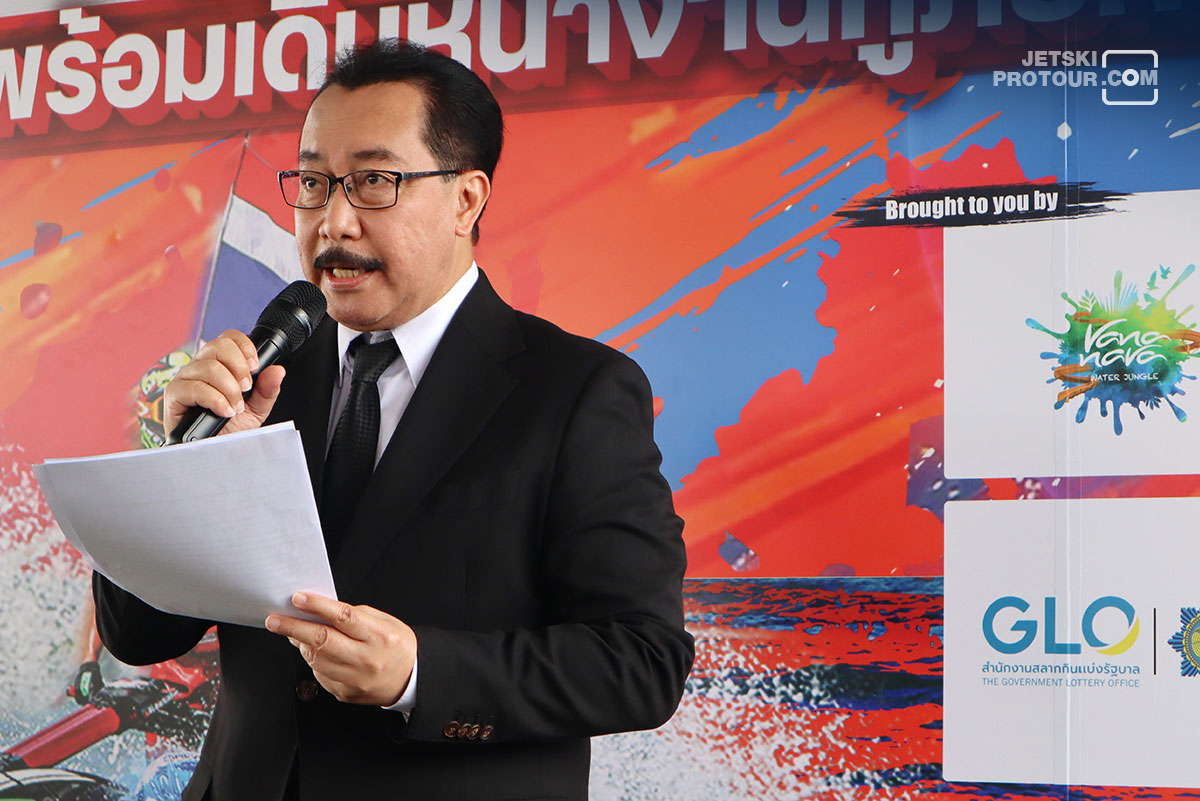 ส่วน ดร.วีระศักด์ โค้วสุรัตน์ เลขาธิการและกรรมการ มูลนิธิเพื่อนพึ่ง (ภา) - ยามยาก เผยว่า วันนี้มาในหลายฐานะ ในฐานะอดีครัฐมนตรีว่าการกระทรวงการท่องเที่ยวและกีฬา ก็ได้เห็นพัฒนาการของกีฬาเจ็ตสกีมาตั้งแต่ยุคเริ่มแรก มาจนถึงการเป็นนักกีฬาระดับโลก ซึ่งถือเป็นความก้าวหน้าที่น่าชื่นชม ทั้งนักกีฬา สตาฟ์โค้ช ผู่ฝึกสอน รวมถึงผู้บริหารสมาคมฯ ที่ทำผลงานได้อย่างดีเยี่ยมมาโดยตลอด ส่วนในฐานะเลขาฯ มูลนิธิเพื่อนพึ่ง (ภา) - ยามยาก ที่เกิดมาแล้ว 30 ปี ก็ดีใจมากที่เห็นถึงความตั้งใจของนักเจ็ตสกีที่เข้ามาเป็นจิตอาสาช่วยเหลือผู้ประสบอุทกภัย และช่วยงานด้านสิ่งแวดล้อมอย่างจริงจัง เป็นเรื่องที่ดีมากที่สมาคมกีฬาเจ็ตสกีจะสร้างอาสาสมัครเข้ามาช่วยงานตรงนี้ให้ได้ถึง 200 คน ซึ่งไม่ใช่เรื่องง่ายเพราะคนที่จะเข้ามาต้องตั้งใจจริง ต้องเสียสละทั้งแรงกาย แรงใจ และที่สำคัญแรงทรัพย์ เรียกว่าต้องมีหัวใจเป็นจิตอาสาที่แท้จริง
