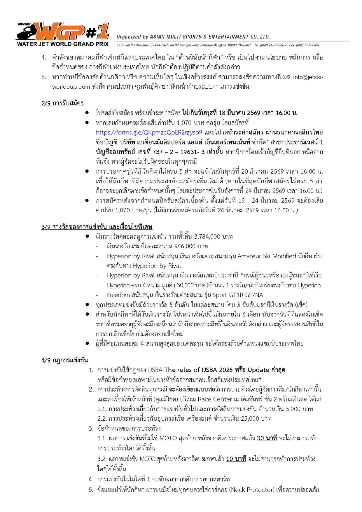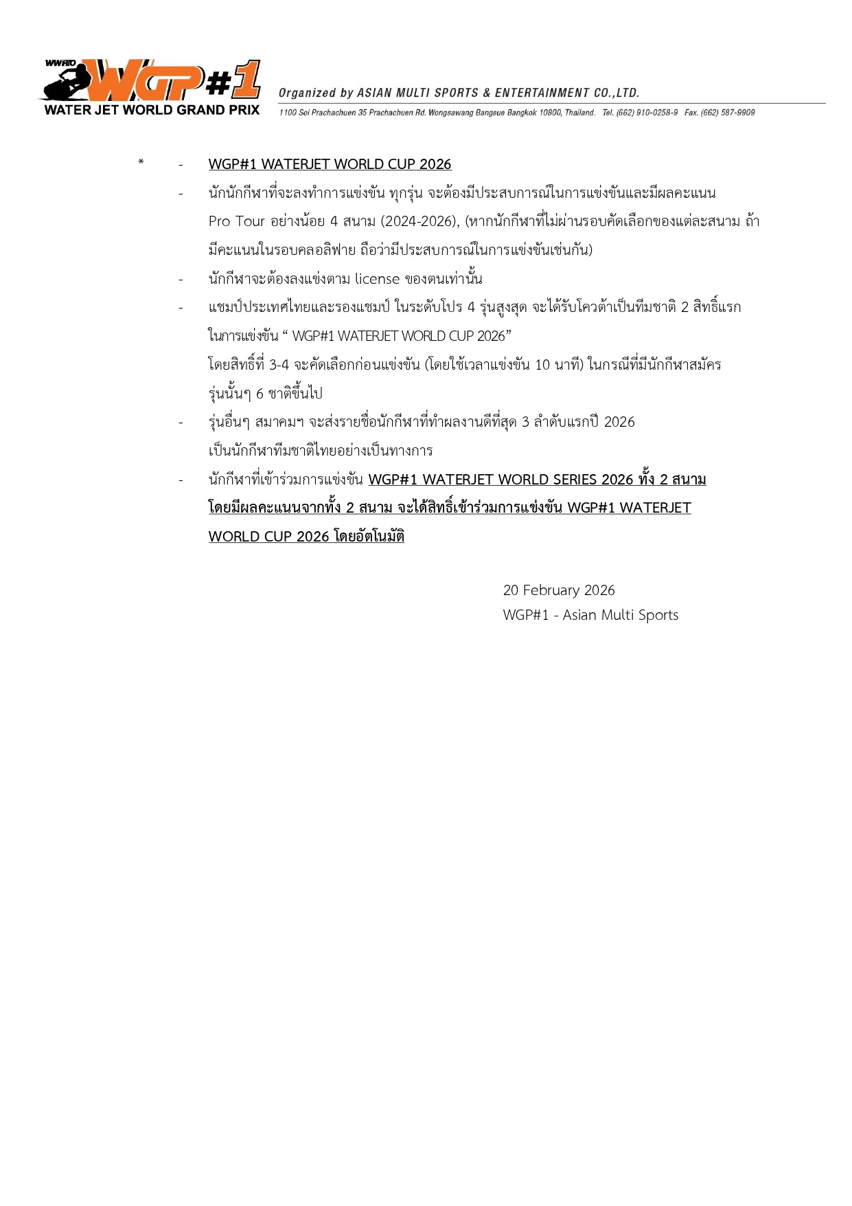 สามารถติดตามข่าวสารการแข่งขัน “ดับเบิลยู จีพี วัน วอเตอร์เจ็ต โปรทัวร์ 2026” ได้ทาง :